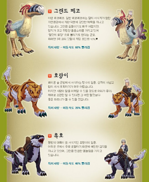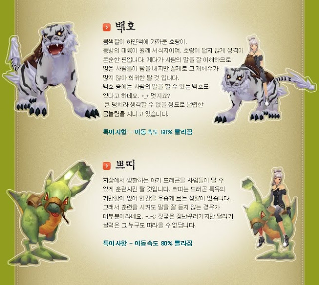 Well, the mounts do not do much for now except providing players with additional speed, which you can see by the xx% from the pictures below. I am lazy to translate the names and descriptions :p
