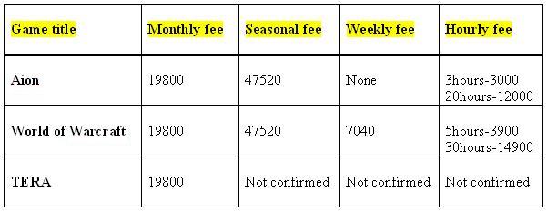 TERA Korea went into Open Beta recently and has already knocked Aion off its throne. According to Korean gaming statistics website, Gametrics, TERA had 14.97% of the internet cafe market share (correct as of 16th Jan) compared to Aion’s 14.88%. According to sources, TERA is expected to hit the commercial phase very soon. With that, the monthly fee for TERA has been confirmed to be 19800 Korean Won, which is about 17.70 USD. Below is a chart comparing the current big 3 P2P MMOs in Korea now (all prices in Korea Won).