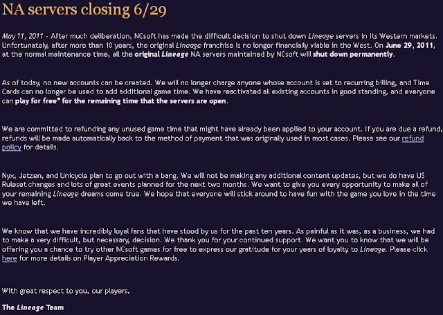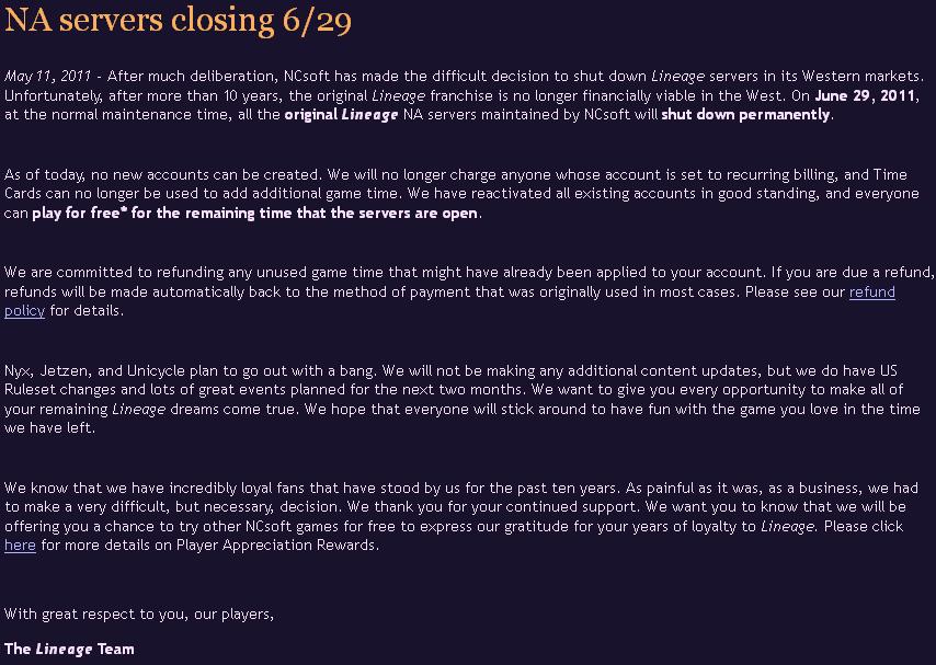 (Source) NCsoft has officially announced the closure of the company’s first major title, Lineage 1, in North America. Lineage 1 is still very popular in South Korea, the country of origin, as there was a new iPhone application made for it and the game is still one of NCsoft’s top earners after 12 long years. The game is currently Free to Play (F2P) for everyone, so if you are interested, head towards the official Lineage 1 website and give it a try!