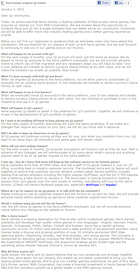 (Source) According to an official forum post, Aeria Games (link) has officially acquired Ijji Games (link), the North American online gaming portal for NHN Corp, which hails from Korea. Now, Aeria Games will be the global publisher for NHN’s games (except for Asia), which effectively means North America and Europe. It all signals an extremely good 2012 for Aeria Games.